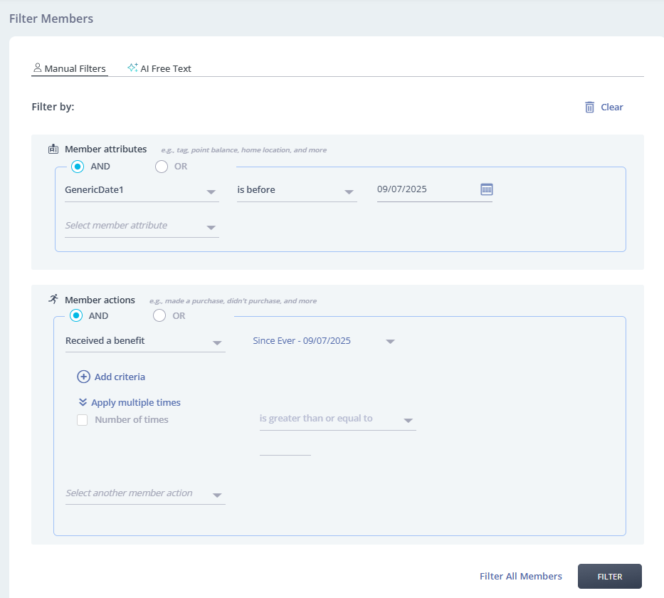 Filter members - Segment your customers according to the date fields for targeted campaigns/actions.Â