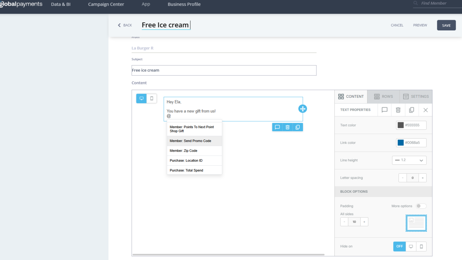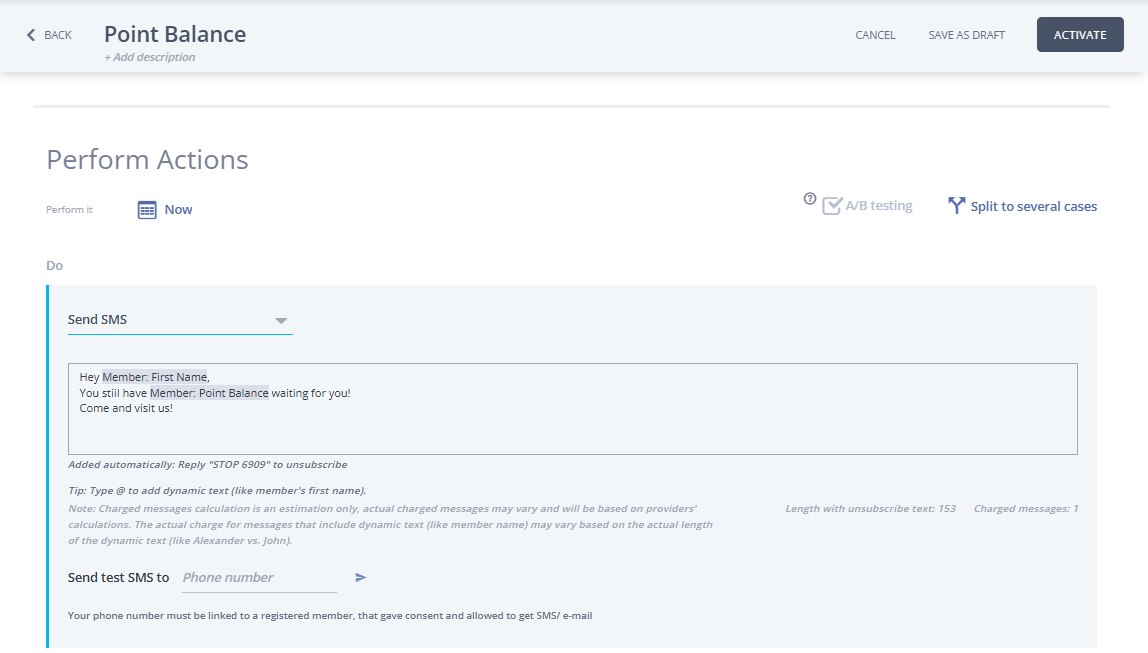 Mentions are a useful feature in the system that allow you to personalize communication with members by dynamically inserting their details into campaign messages. They are available across multiple communication tools, including Email and SMS, and provide flexibility to also enrich Push and In-App messages. By using mentions, each message can include real-time member information such as purchase data, loyalty progress, or profile details. This ensures consistent, relevant, and customized experiences across all channels.