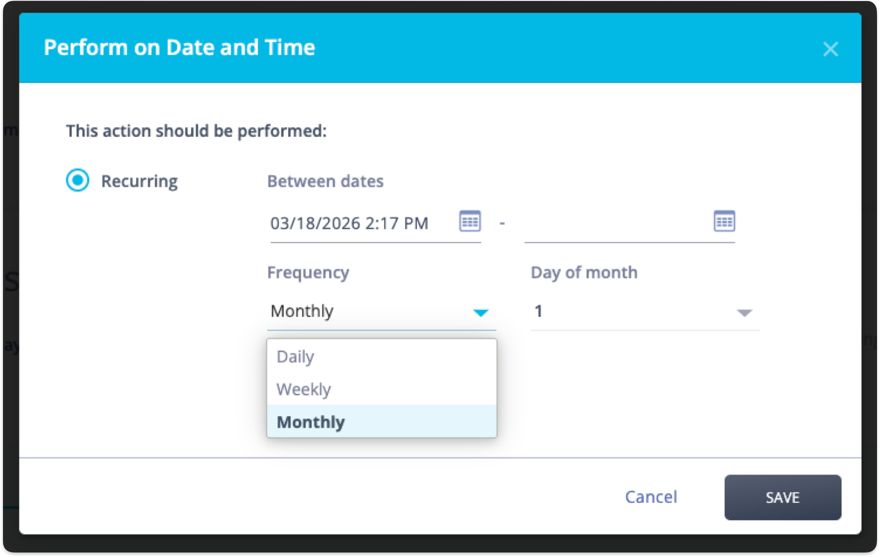 Activities now support configurable Recurrent scheduling, including three frequencies: Daily, Weekly, and Monthly. This allows activities to be automated on the cadence that best fits each program’s operational needs, improving flexibility for setup and ongoing management.