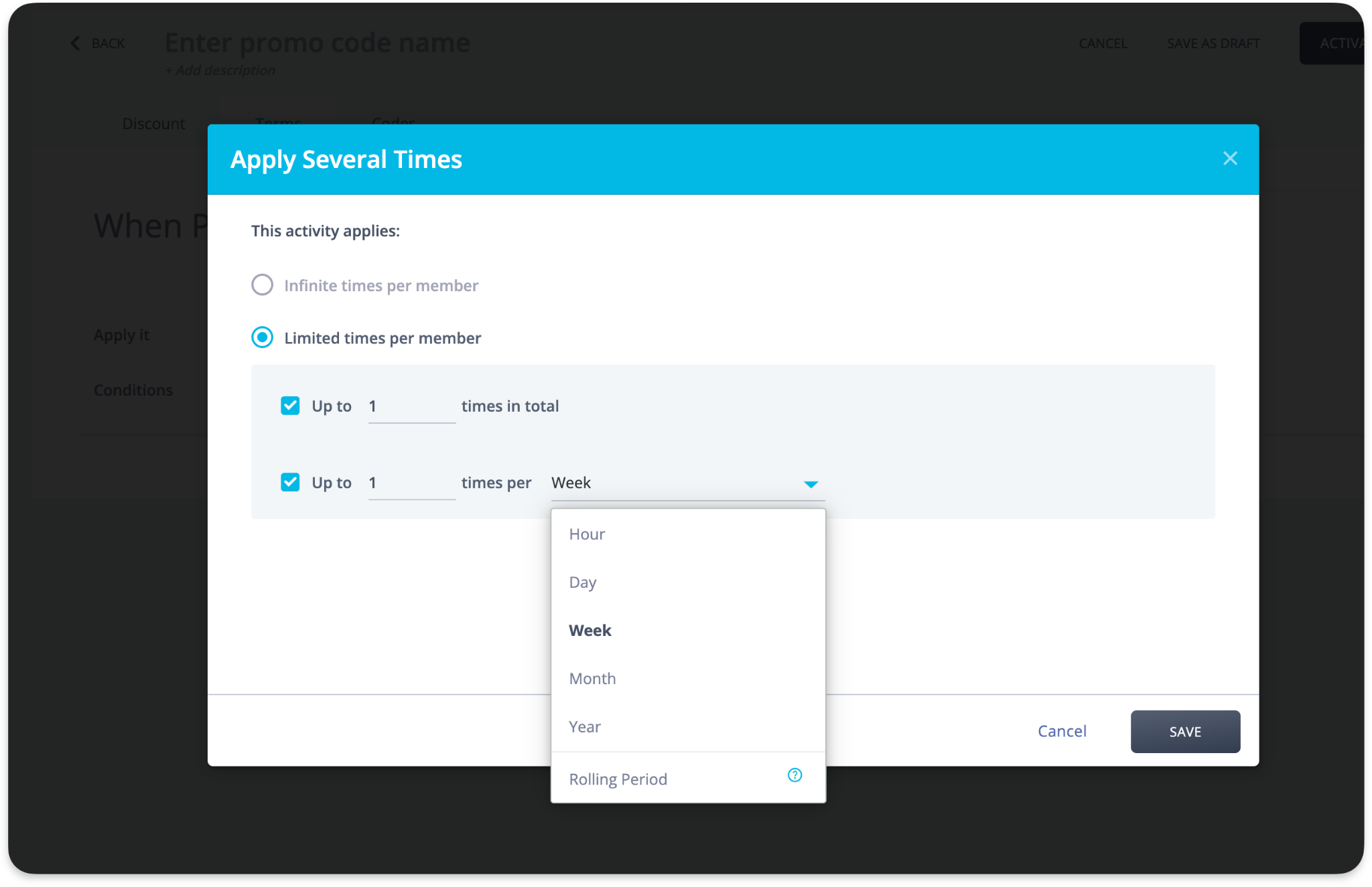 - Time-based per-member cap – “Up to X times per [day/week/month/year].”