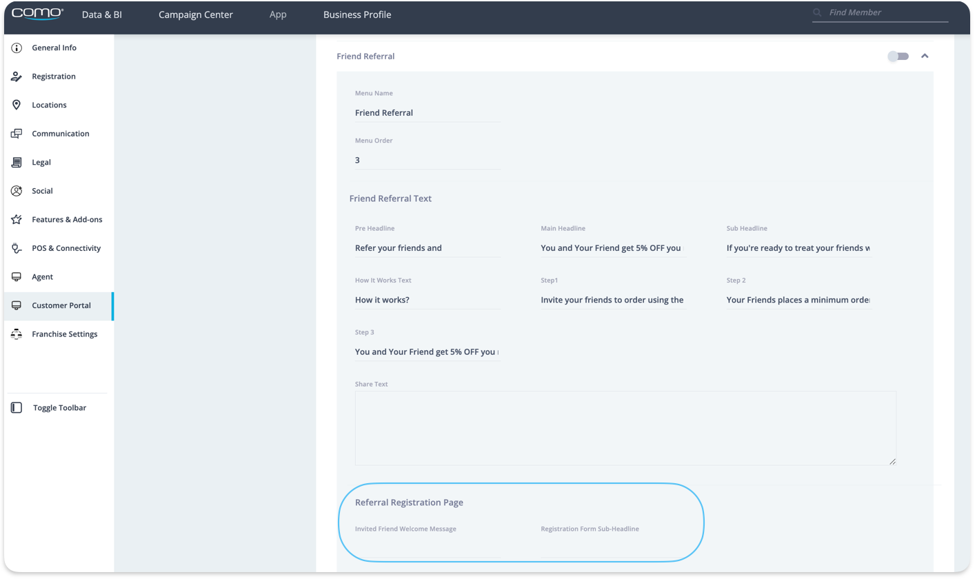 Under Business Profile, Customer Portal, Friend Referral, merchants can customize: