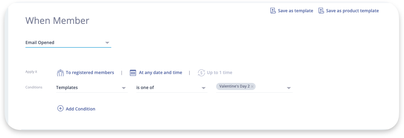 A new email-based action, Email Opened, is now Generally Available. The action triggers the first time a member opens a specific email, letting you identify first-time engagement and build automations on top of it (for example, follow-up flows, tagging, or reward delivery). Subsequent opens of the same email do not retrigger the action, so each member is counted once per email.