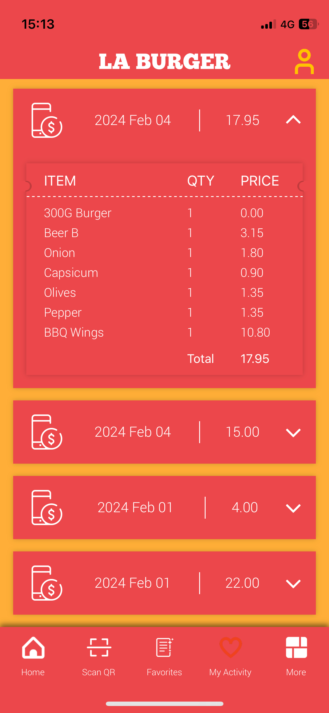 'My Activity Screen' (purchase history) members can review their purchase details including the item name, quantity, and amount, as well as tax and discounts if the POS sends it.